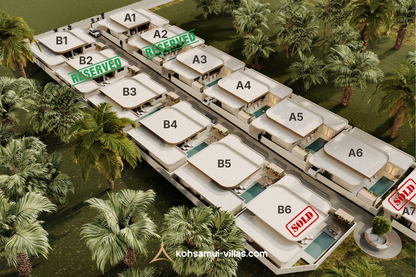 Modern 3 bedroom mountain-view villas for sale in Chaweng, Koh Samui. Freehold ownership, private pools, easy access, close to schools, beaches, and supermarkets. Free furniture package worth 1M THB